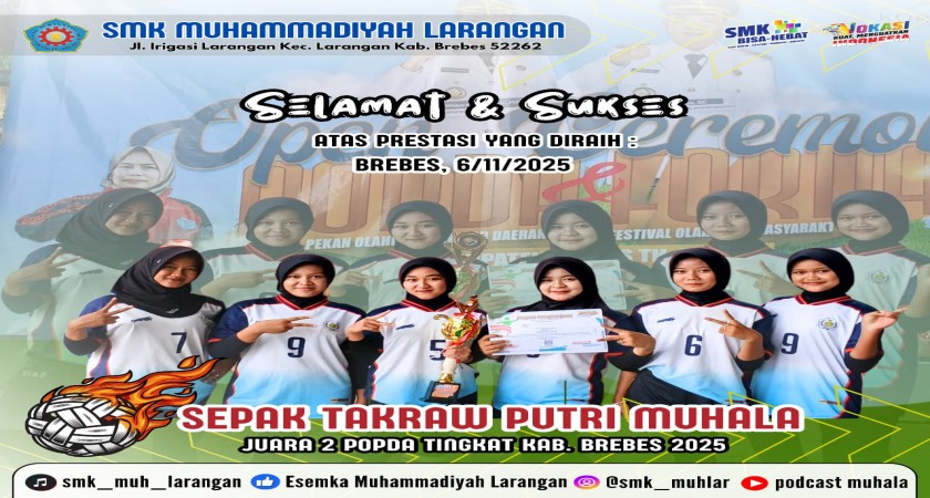 Brebes – Prestasi gemilang kembali ditorehkan oleh SMK Muhammadiyah Larangan. Tim Sepak Takraw Putri sekolah ini sukses meraih Juara 2 dalam ajang Pekan Olahraga Pelajar Daerah (POPDA) Tingkat Kabupaten Brebes Tahun 2025, yang digelar pada Tanggal 06 November 2025 bertempat di GOR Sasana Krida Adikarsa Brebes. Kemenangan ini menjadi bukti nyata bahwa semangat, kerja keras, dan kedisiplinan mampu menghasilkan kebanggaan bagi sekolah, orang tua, dan masyarakat.